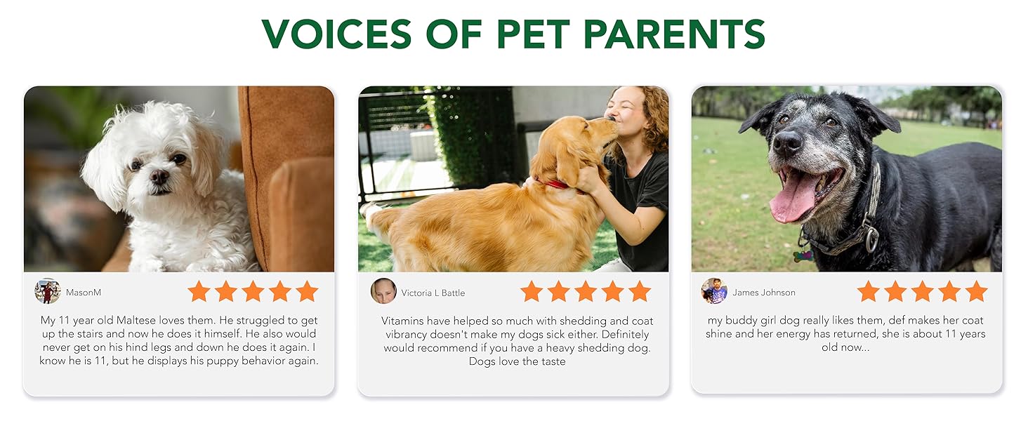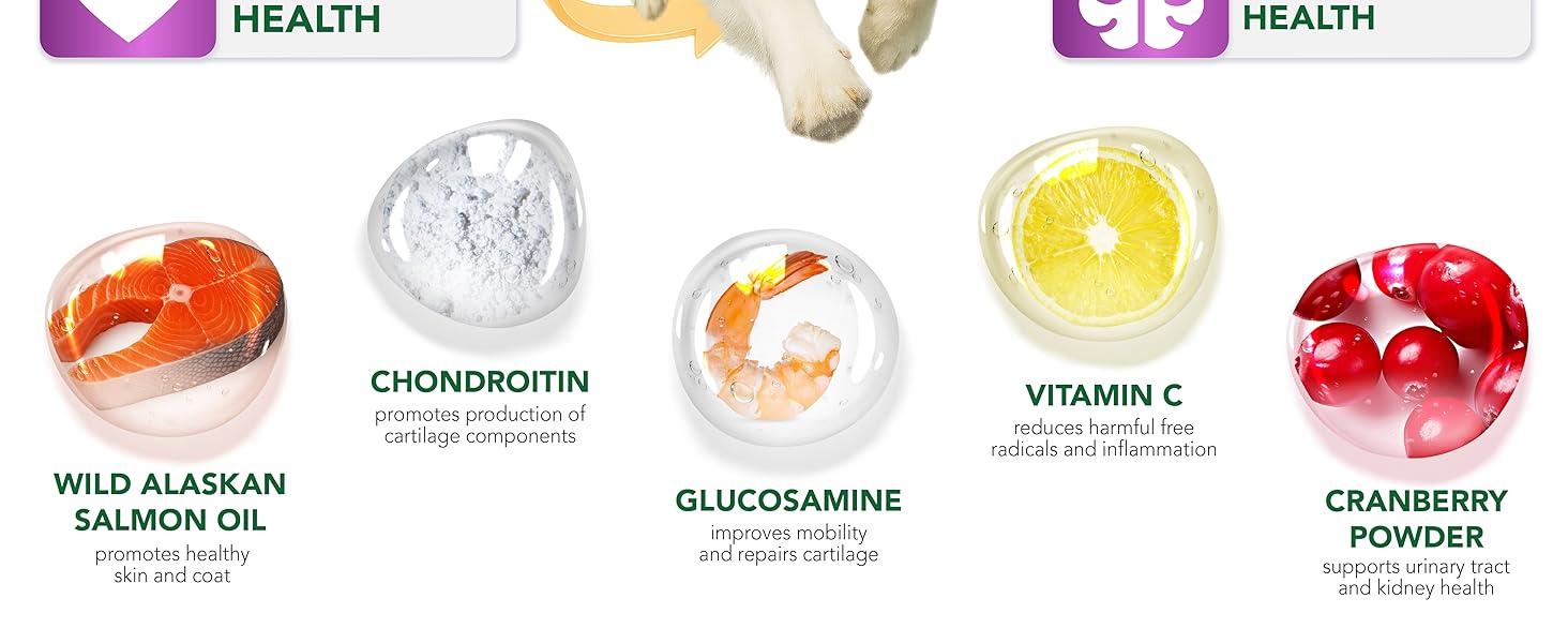 - Gut, Skin & Coat: These vitamins for dogs contain Omega 3 fatty acids, which can help reduce itchiness, redness, and excessive scratching or licking, promoting healthier skin and a shinier