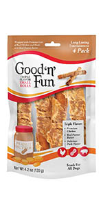 Good ‘n’ fun brand contains a savory smorgasbord of flavors that dogs love most. These delicious chew treats are made from the finest ingredients, including premium beef hide and real chicken, to create truly delightful, long-lasting treats your dog will love. These delicious chew treats are made from rawhide and pork hide, then wrapped with real chicken to create this truly delightful treat your dog will love. The natural chewing action helps reduce tartar buildup, so there’s something you both can love. Snack for all sized dogs. Give one per day. Always provide plenty of fresh drinking water.